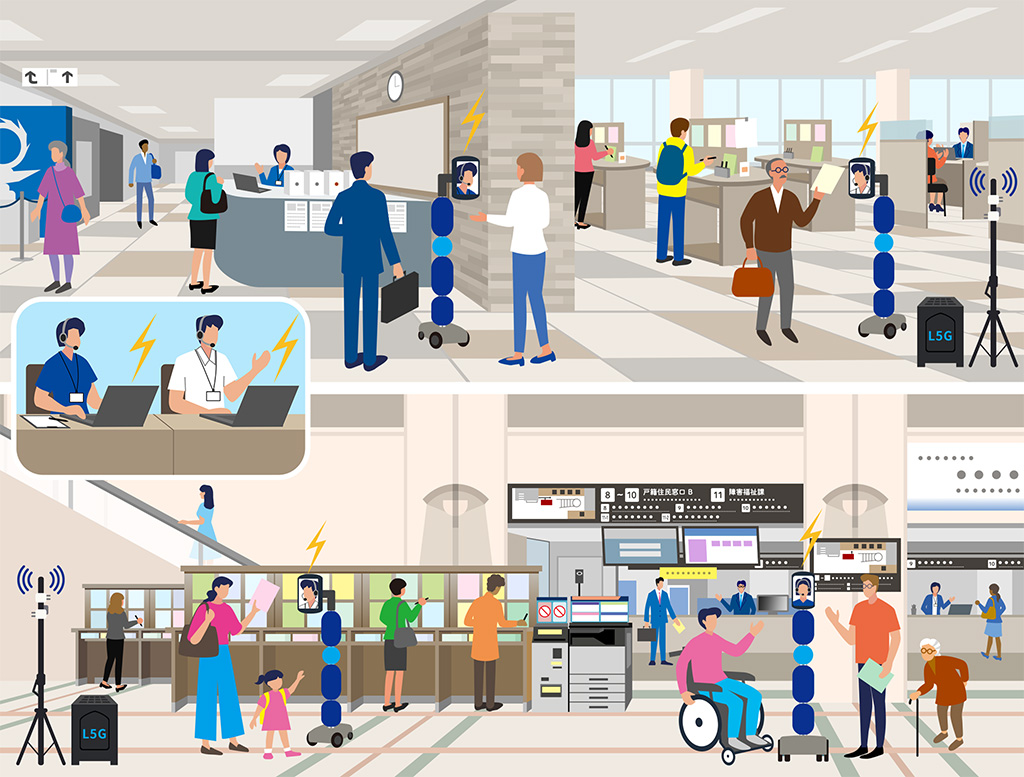 この試みは、各区役所内に構築されたローカル5Gによる大容量・低遅延の安定した通信基盤を活用することで、遠隔地のオペレーターが2つの自治体のnewmeを操作し、場所にとらわれずに質の高いサービスを提供する、持続可能な行政運営の新たなBPOモデルを構築するものです。
